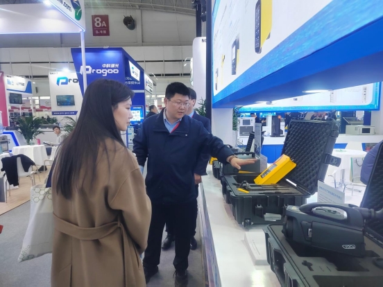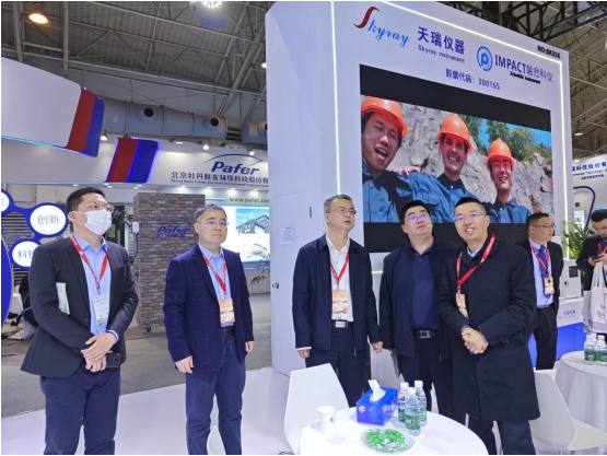 中国情况监测总站副站长毛玉如莅(左三)临天瑞仪器展台观赏,天瑞仪器副总司理、磐合科仪董事长黎桥(右一)热忱接待