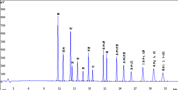 液相色谱柱:Ultimate PAH共用柱,C18,长250mm,直径4.6mm,颗粒直径5um