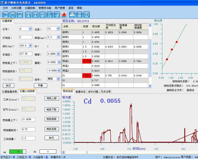 于原子团阅读光谱仪仪 228.8 nm 处,操控风气-乙炔贫燃燃烧,以水调零,精确测量试液的吸光度,减去伴同试料的空岗试悬浊液的吸光度,从目标曲线上推广杳出崩溃的镉质量浓度。