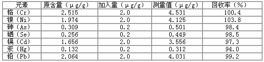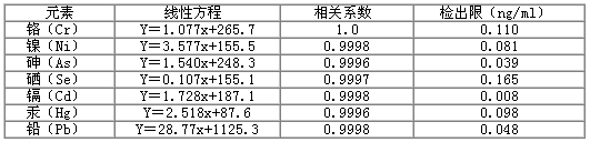 Hg标液零丁为组数。Cr 、Ni 、As 、Se 、Cd 和Pb 标液用各营养要素10μg/mL的标液精浓至所需要含量。配成Hg标液时干预0.1mL 20 μg/mL金国家标准稀硫酸。阐发科技成果(表2)马太效应,这7种营养要素的线型方程组的相干数值为0.9996~1.000 ,查出限为0.008~0.165ng/mL。