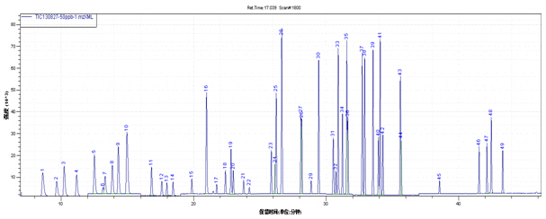 1、1,1-二氯氯氯丁二烯 2、二氯二氧化氮 3、反式1,2-二氯氯氯丁二烯 4、1,1-二氯乙烷 5、顺式1,2-二氯氯氯丁二烯/2,2-二氯丙烷 6、溴氯二氧化氮 7、氯仿 8、1,1,1-三氯乙烷 9、1,1-二氯丙烯/四氯化碳 10、苯/1,2-二氯乙烷 11、三氯氯氯丁二烯 12、1,2-二氯丙烷 13、二溴二氧化氮 14、一溴二氯二氧化氮 15、順式1,3-二氯丙烯 16、甲苯 17、反式1,3-二氯丙烯 18、1,1,2-三氯乙烷 19、四氯氯氯丁二烯 20、1,3-二氯丙烷 21、二溴氯二氧化氮 22、1,2-二溴乙烷 23、氯苯 24、1,1,1,2-四氯乙烷 25、乙苯 26、间/对二甲苯 27、邻二甲苯 28、苯氯氯丁二烯 29、溴仿 30、异丙苯 31、溴苯/1,1,2,2-四氯乙烷 32、1,2,3-三氯丙烷 33、正丙苯 34、2-氯甲苯 35、1,3,5-三级甲等基苯 36、4-氯甲苯 37、叔丁基苯 38、1,2,4-三级甲等基苯 39、仲丁基苯 40、1,4-二氯苯 41、4-异丙基甲苯 42、1,3-二氯苯 43、正丁基苯 44、1,2-二氯苯 45、1,2-二溴-3-氯二氧化氮 46、1,2,4-三氯苯 47、六氯丁二烯 48、萘 49、1,2,3-三氯苯