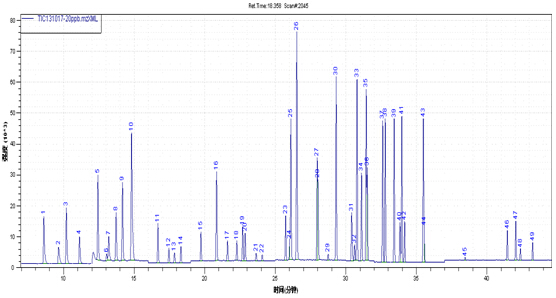 图2. 54种挥(hui)发性(xing)无机物(VOCsജ)规范物资在SIಌM形式下的TIC图