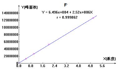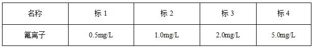 顺次用移液枪移取氟离子规范溶液(1000mg/L)0.05mL、0.1mL、0.2mL、0.5mL于4个100mL的容量瓶中,用超纯水定容至刻度并摇匀,各规范曲线的浓度详见表1,氟离子的曲线方程及线性如图2所示。